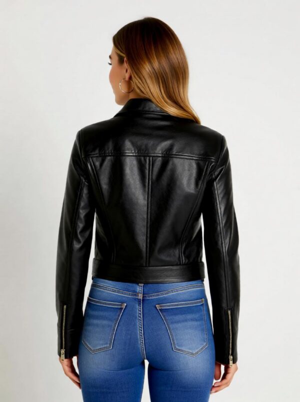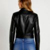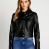 Minimalistliku lõikega lühike nahkjakk nööpkinnitusega.