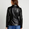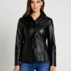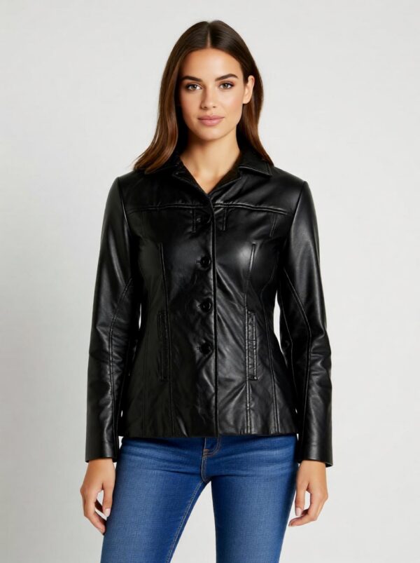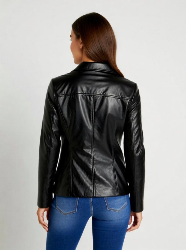 Lakoonilise disainiga sirge lõikega nahkjakk.